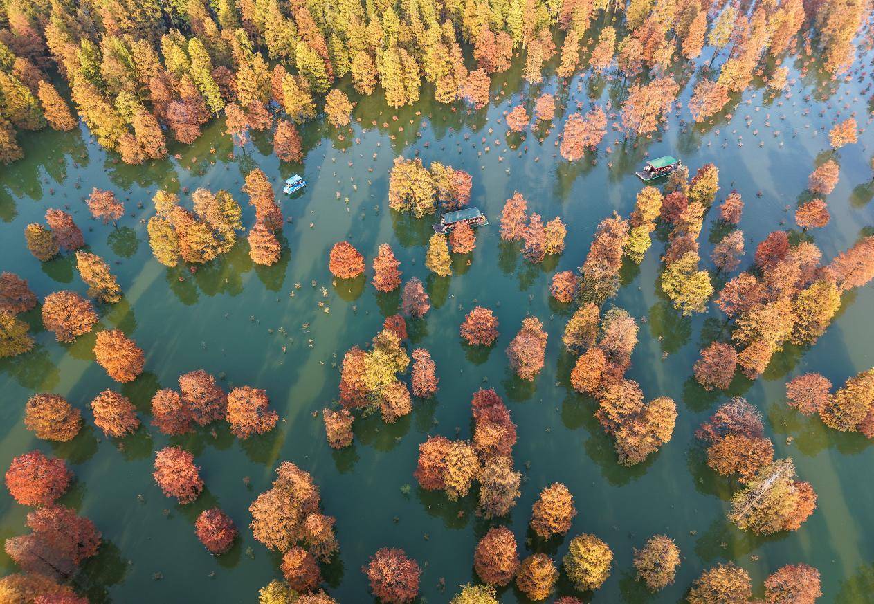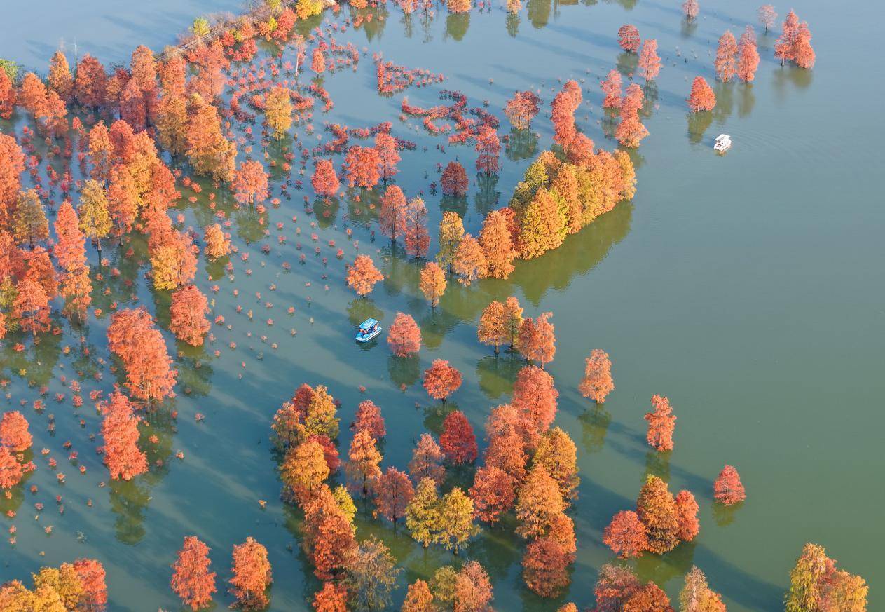 从空中俯瞰,这片池杉林犹如一条环绕水岸的“火焰带”,与碧蓝的湖水、枯黄的草地形成强烈的色差,构成一幅色彩浓烈、撼人心魄的天然画卷。穿行于林间的游船,让游客仿佛被这片炽热的“火焰”所包围。阳光穿透层层叠叠的红色针叶,洒下温暖的光斑;水面如镜,将这片瑰丽倒映其中,上下交融,恍如幻境,让人顿生“水火交融”的奇妙观感。
